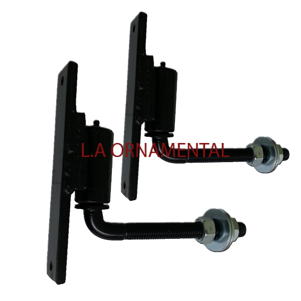 Hinge is made up of a mounting plate (flange)which attaches to the wall   or post and the J-Bolt arm which attaches to the gate.